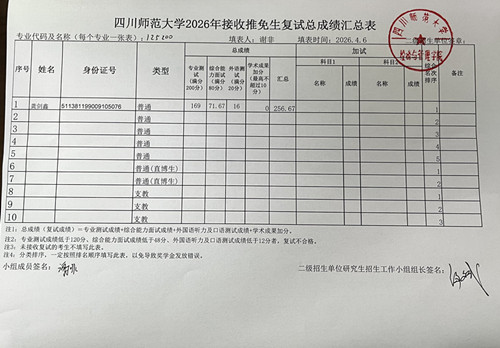 根据《四川师范大学2026年硕士研究生招生复试录取办法》,现将四川师范大学经济与管理学院2026年MBAMPA复试成绩公示如下(详见附件),公示时间:2026年4月8日-4月13日。如有异议,请向学院研究生招生督查小组实名反映。