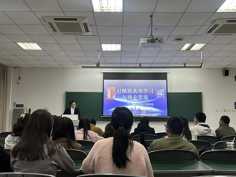 为助力师生把握 AI 时代发展机遇,提升数字化学习效率与商业实践能力,4月12日上午,学院特邀上简科技创始人兼CEO、科普作家、笔漫文化创始人兼董事长、AI算法专家廖显东举办《AI赋能高效学习与商业变现》专题讲座。2025级全体MBA学员参加。